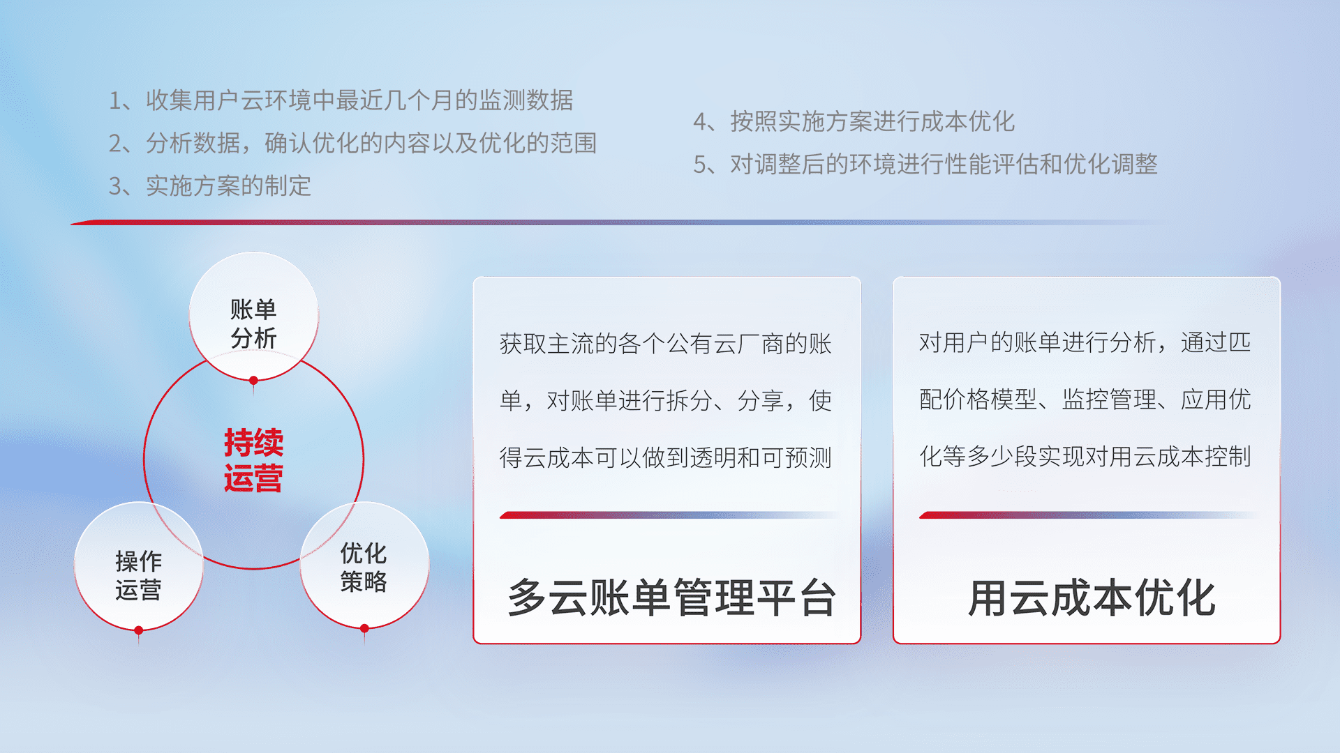 通过多云纳管,,以统一的资源数据模型把客户的云资源进行抽象和封装,,,,进而实现对多云资源的统一操作,,保障云资源管理的可靠性、、稳定性与可用性。。。。量身定制化运维内容,,,配置、、、、开发运维、、、、补丁管理、、、备份、、、、监控、、认证和访问管理、、、、审计和日常巡检等,,,,保障在用云过程中的可靠度,,,,稳定度以及高可用率。。