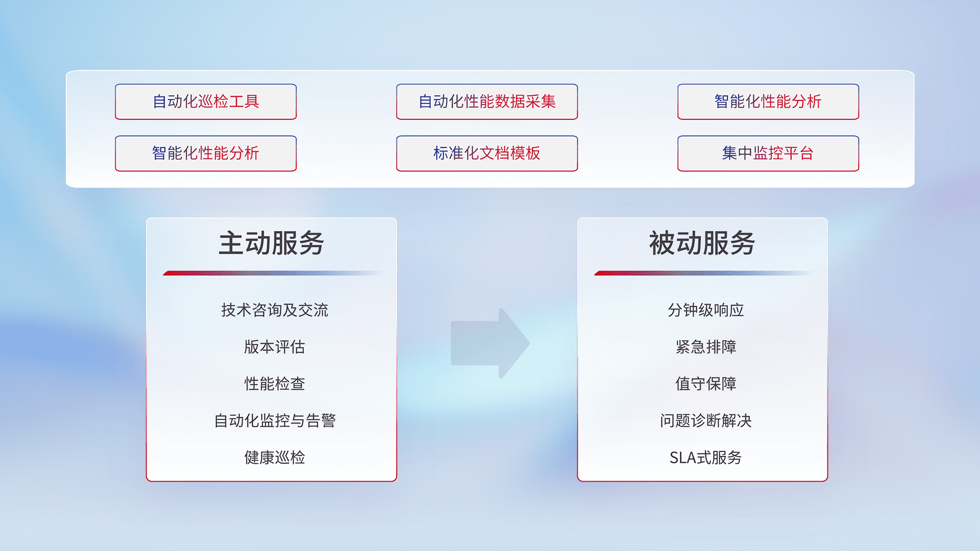 智能化工具和标准化文档,,,,保障服务质量,,提供主动服务(包含技术咨询、、、、版本评估、、、性能检查、、自动化监控与告警、、、、健康巡检)和被动服务包含(分钟级响应、、紧急排障、、、、值守保障、、、问题诊断解决、、、、SLA服务)。。。