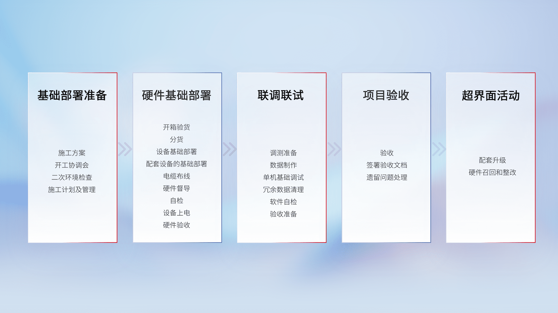 从基础部署准备、、硬件基础部署、、、、联调联试、、项目验收、、、、越界面活动的全过程可追溯,,保证施工质量和进度。。。
